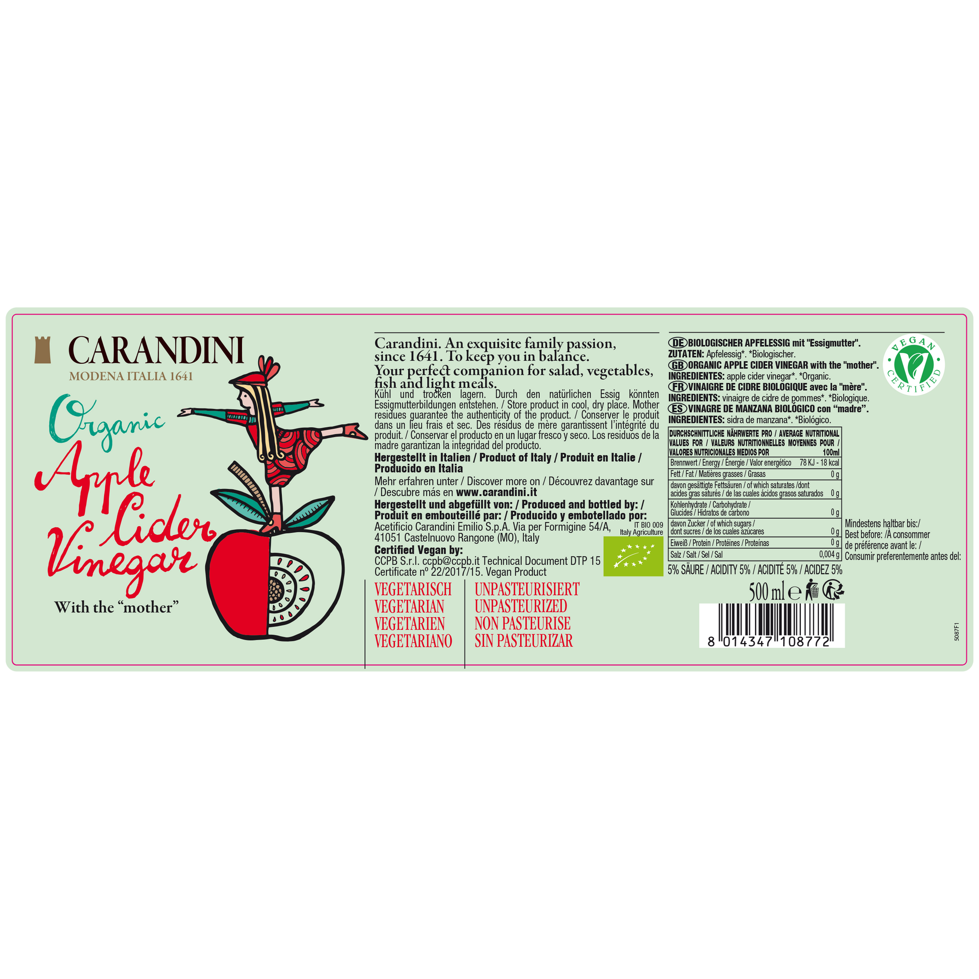 Carandini Organic Apple Cider Vinegar with ”the mother” is delicate, fresh with a flavorful aroma and distinctive flavor.