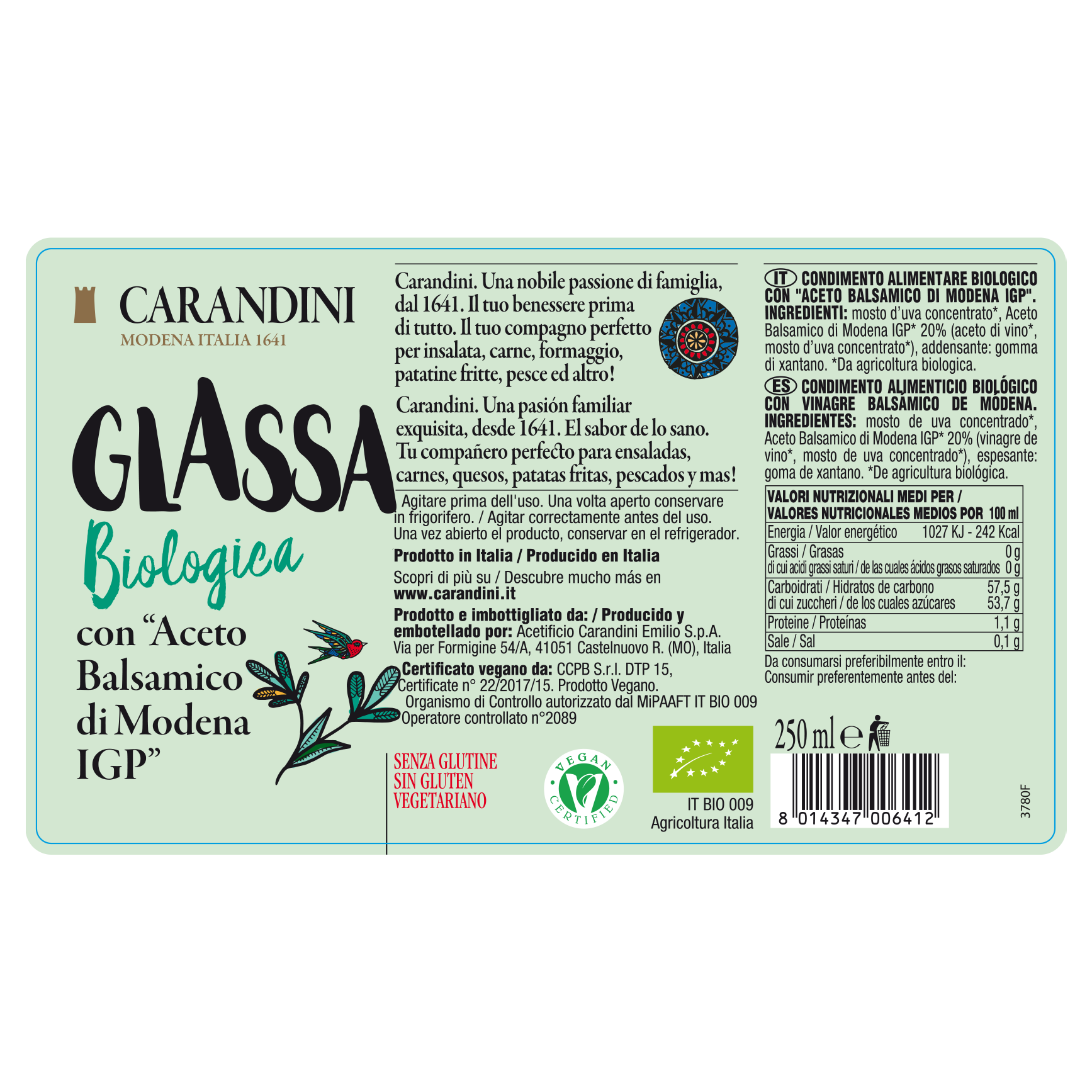 Le Glasse Biologiche Carandini estendono le possibili interpretazioni ed esperienze di utilizzo dell’Aceto Balsamico di Modena IGP e del Condimento Bianco in un prodotto dalla consistenza cremosa, pratico da utilizzare e con un gusto intenso.